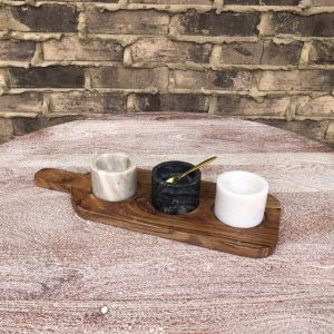 Acacia Wood Board With Marble Pinch Pots & Brass Spoon, Set Of Five